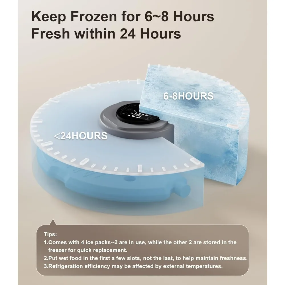 【What You Should Know】 The auto cat feeder measures 12.6’’x12.9’’x3.4’’. The bowl is 4.4'' max in length, 1.9'' max in height. Ice packs stay frozen for 6-8 hours and can keep wet food fresh for up to 24 hours.