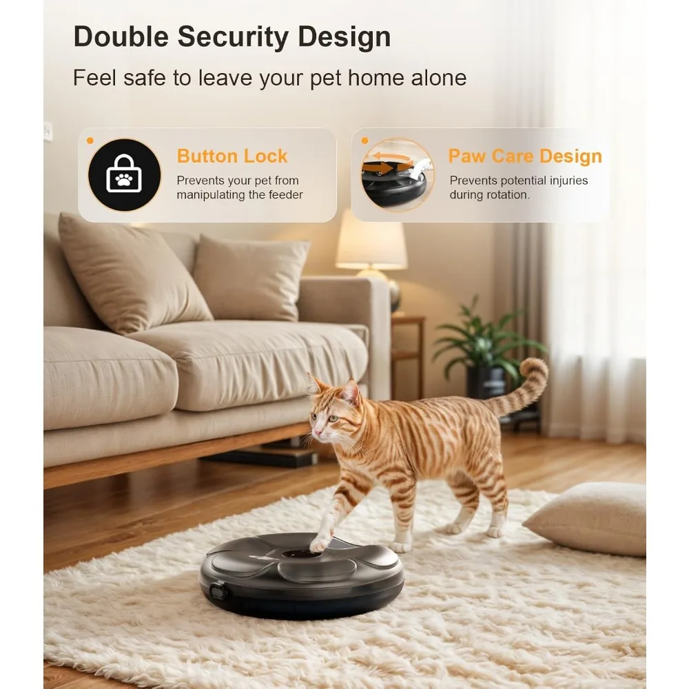【Care for Your Pet's Safety & Health】These automatic cat feeders incorporate a paw-care design to prevent potential injuries. Crafted from food grade BPA-free ABS material, it prioritizes your pet's health. Both the top cover and food tray are easily removable for cleaning-simply rinse under running water. Note: Avoid getting the electronic components wet when cleaning.
