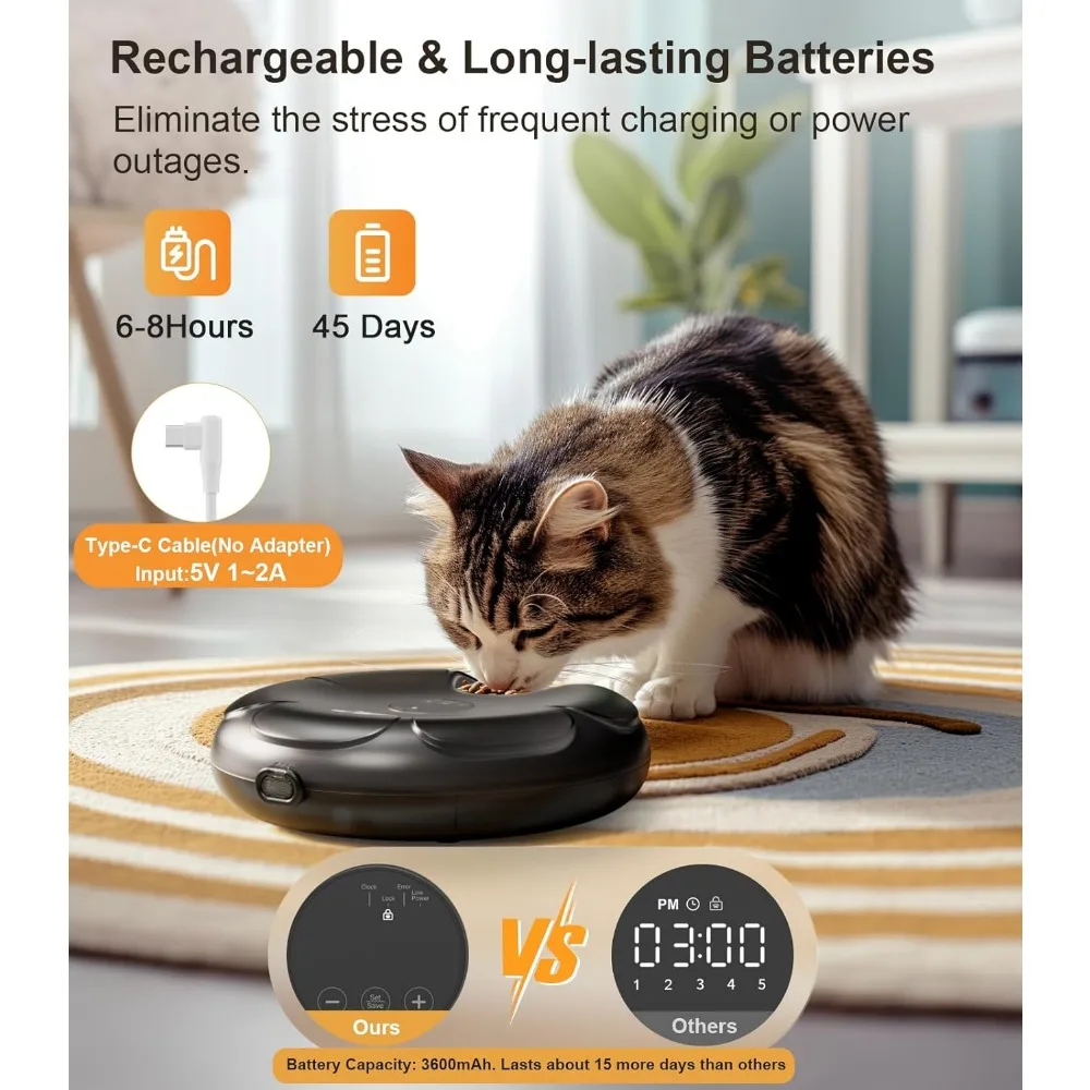 - 【Cordless, Rechargable & Long-lasting】With built-in rechargeable batteries, you can conveniently place the feeder anywhere in your home without worrying about tangled cords or restricted placement once it's fully charged. A full charge lasts about 45 days, eliminating the stress of frequent charging or power outages. (A Type-C charging cable is included; the adapter is not provided. Simply connect it to a 5V 1~2A adapter /outlet)