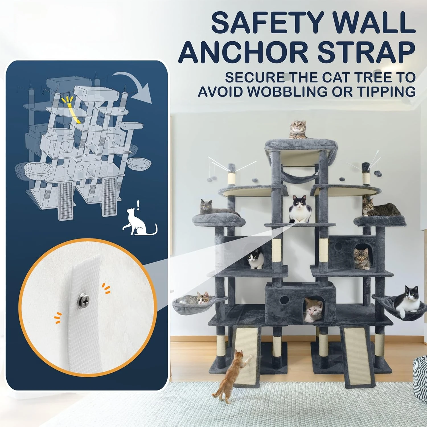 Built for Strength, Stability, and Long-Term Use – Made from premium P2-grade particleboard with a reinforced base and support posts, this towering structure offers a safe environment. It’s wrapped in durable faux fur, and the posts are covered in wear-resistant sisal rope, perfect for daily clawing. Comes with a safety wall anchor strap so you can secure the cat tree to the wall for extra stability. Ideal for up to 6 large cats or 10 medium-sized cats to play, climb, and nap simultaneously.