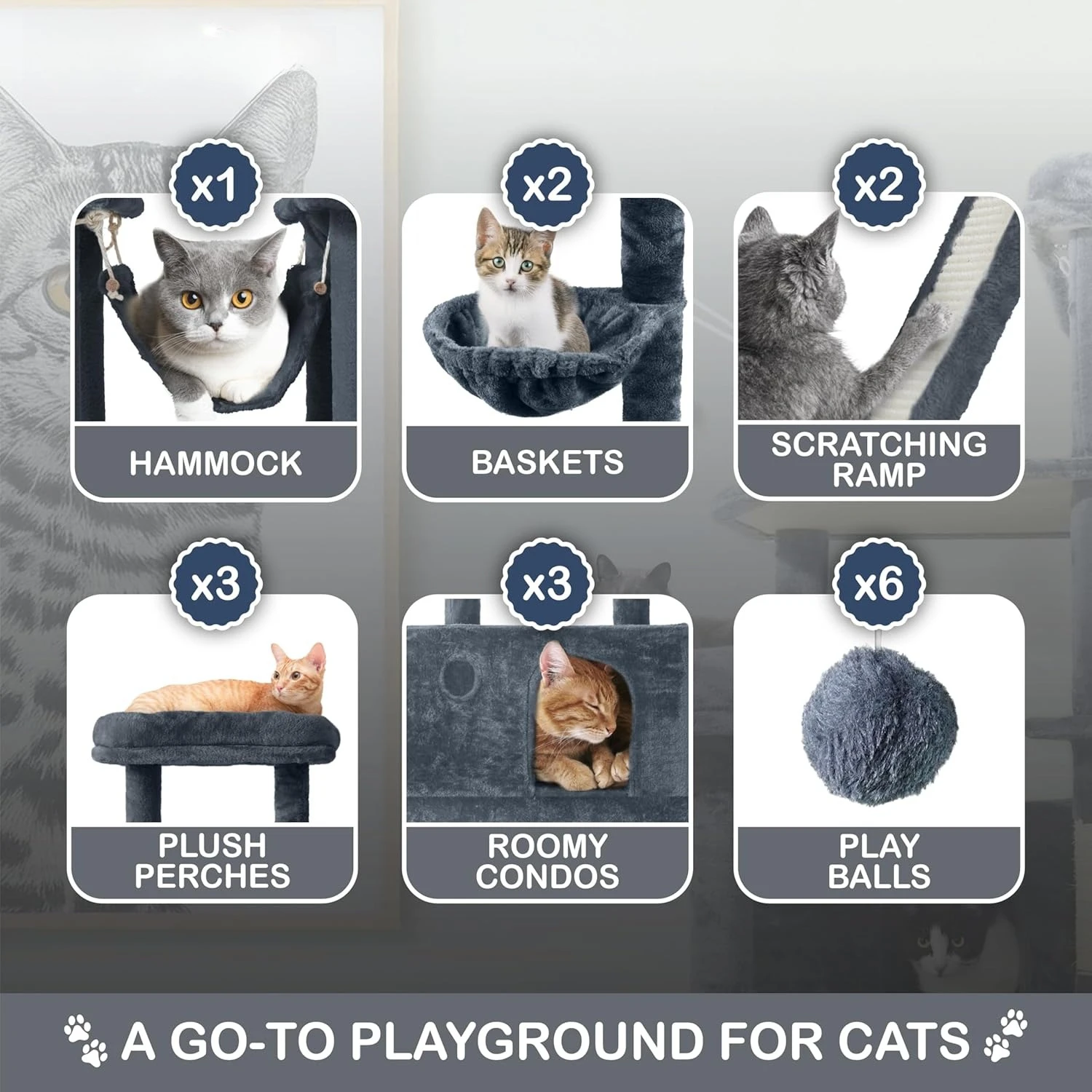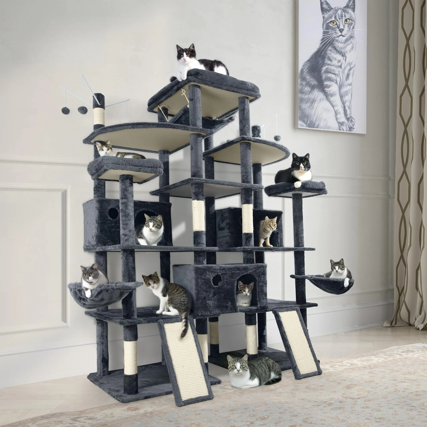 Designed for All Ages and Sizes – Whether your cat is a playful kitten or a senior napper, the staircase-like multi-level design makes movement easy and safe. The layout supports natural feline behaviors like scratching, jumping, exploring, and perching, featuring: 1 cozy hammock, 2 hanging baskets, 2 scratching ramps, 3 soft perches, 3 roomy cat condos, 6 play balls, and countless scratching posts—it’s a complete cat entertainment center!