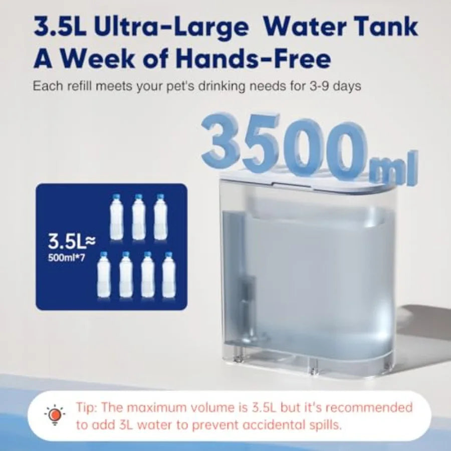 Wastewater Separation Design - Our cat water fountain features a unique clean & wastewater separation system with a 118.4oz/3.5L clean water tank and a 50.7oz/1.5L wastewater tank, there is no circulating sewage water and designed to keep your pet's water fresh and healthy