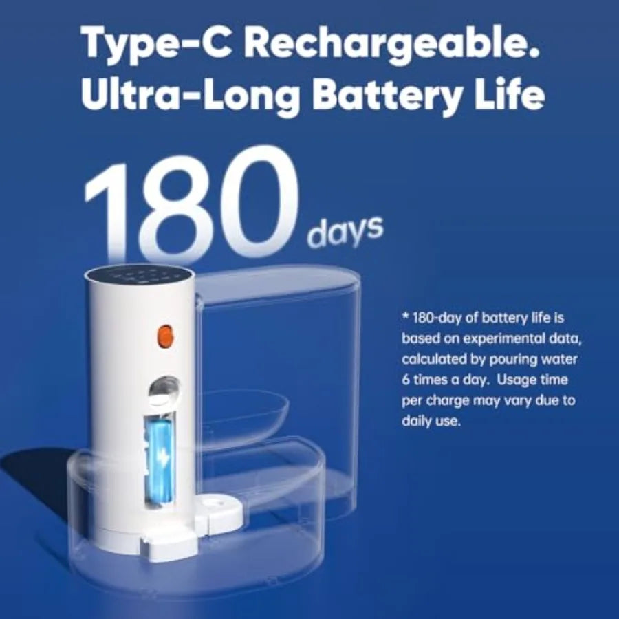 Rechargeable Battery Powered - Our water fountains is equipped with a built-in 3000mAh rechargeable battery, our cat water dispenser can run for over 180 days. Make sure your pet has access to fresh water in all situations